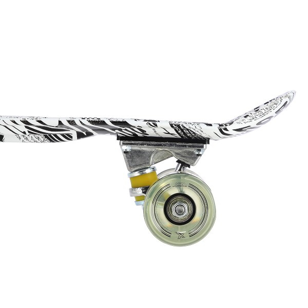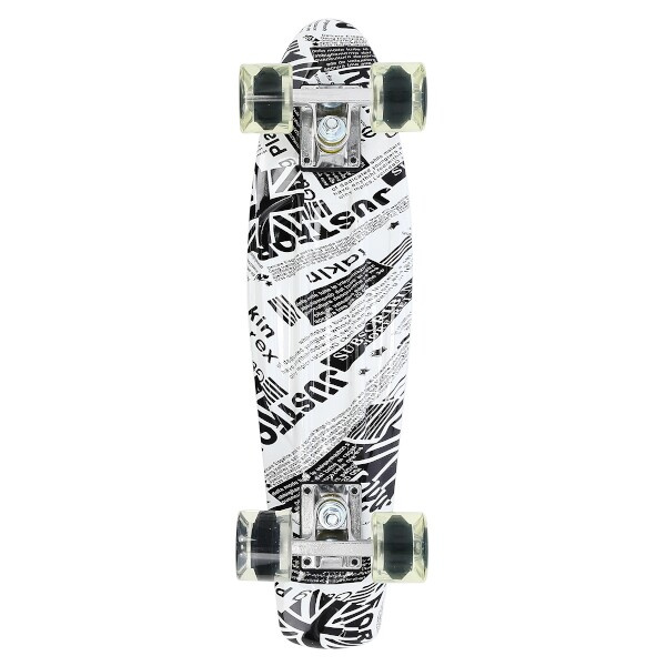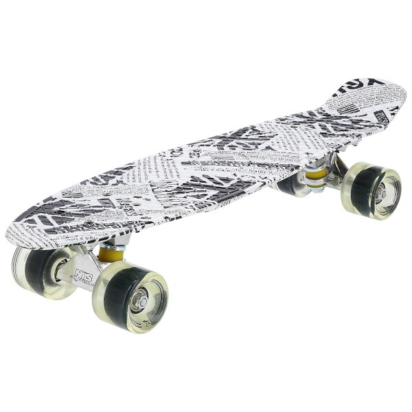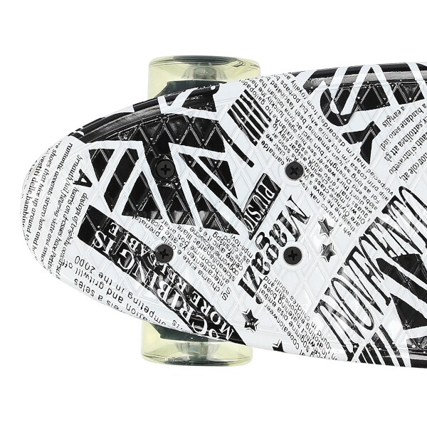 Pennyboard NILS Extreme ART PAPER má celoplošný čierno-biely dizajn, inšpirovaný novinovými článkami. Strieborné trucky držia priehľadné kolieska s logom výrobcu.