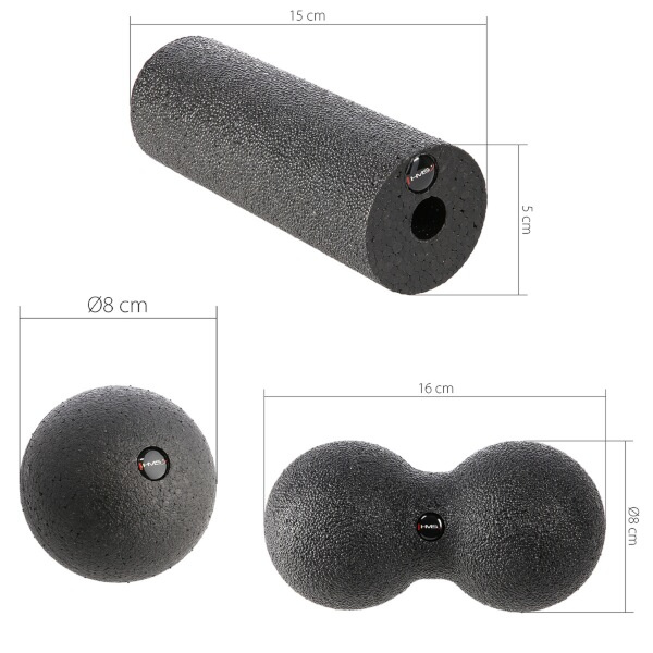 Masážna súprava HMS FSBM07 je dokonalý nástroj na automasáž, ktorý obsahuje všetko, čo potrebujete na udržanie zdravia vášho tela. Malá loptička s priemerom 8 cm je presne to, čo potrebujete na masáž spúšťacích bodov a miest s napätou fasciou. Dvojitá lopta HMS je ideálna na terapiu hlbokých svalových skupín alebo ťažko prístupných častí tela, ako sú krk, zadok, ramená a hrudník. S mini valčekom si môžete uvoľniť predlaktia alebo chodidlá.