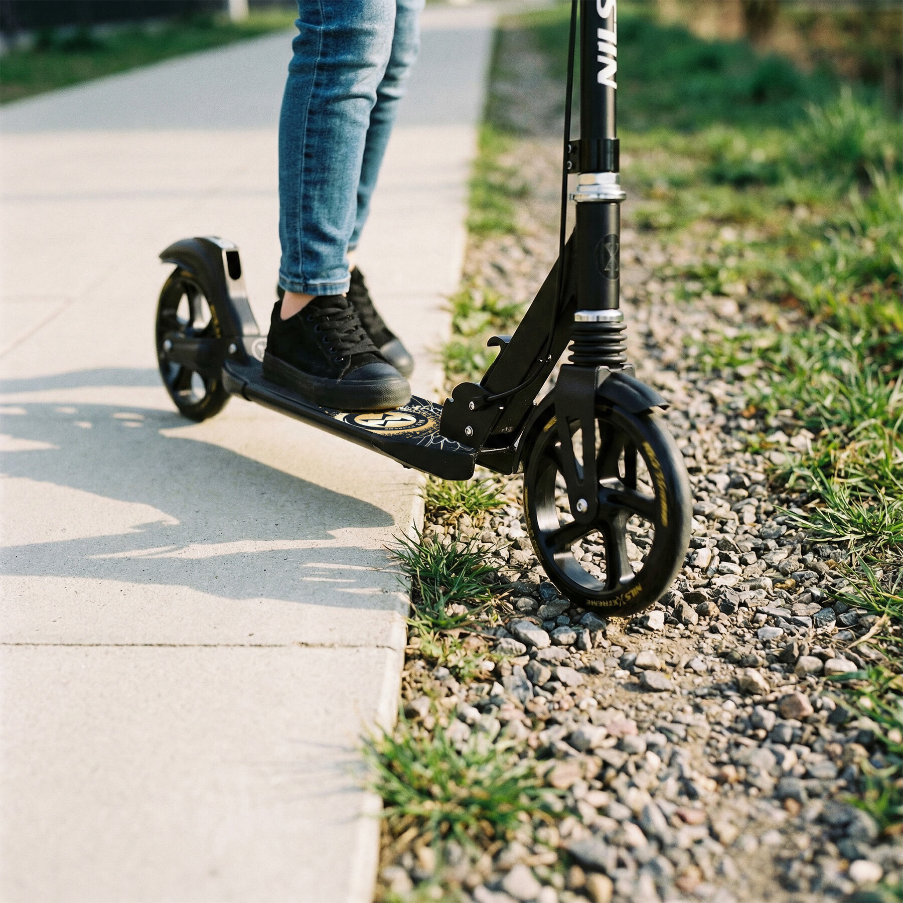 Kolieska s priemerom 200 mm umožňujú hladkú jazdu na asfalte, chodníkoch aj dlažbe. Odolná konštrukcia z kombinácie ocele a hliníka zvyšuje bezpečnosť a životnosť, pričom si kolobežka zachováva optimálnu hmotnosť.
