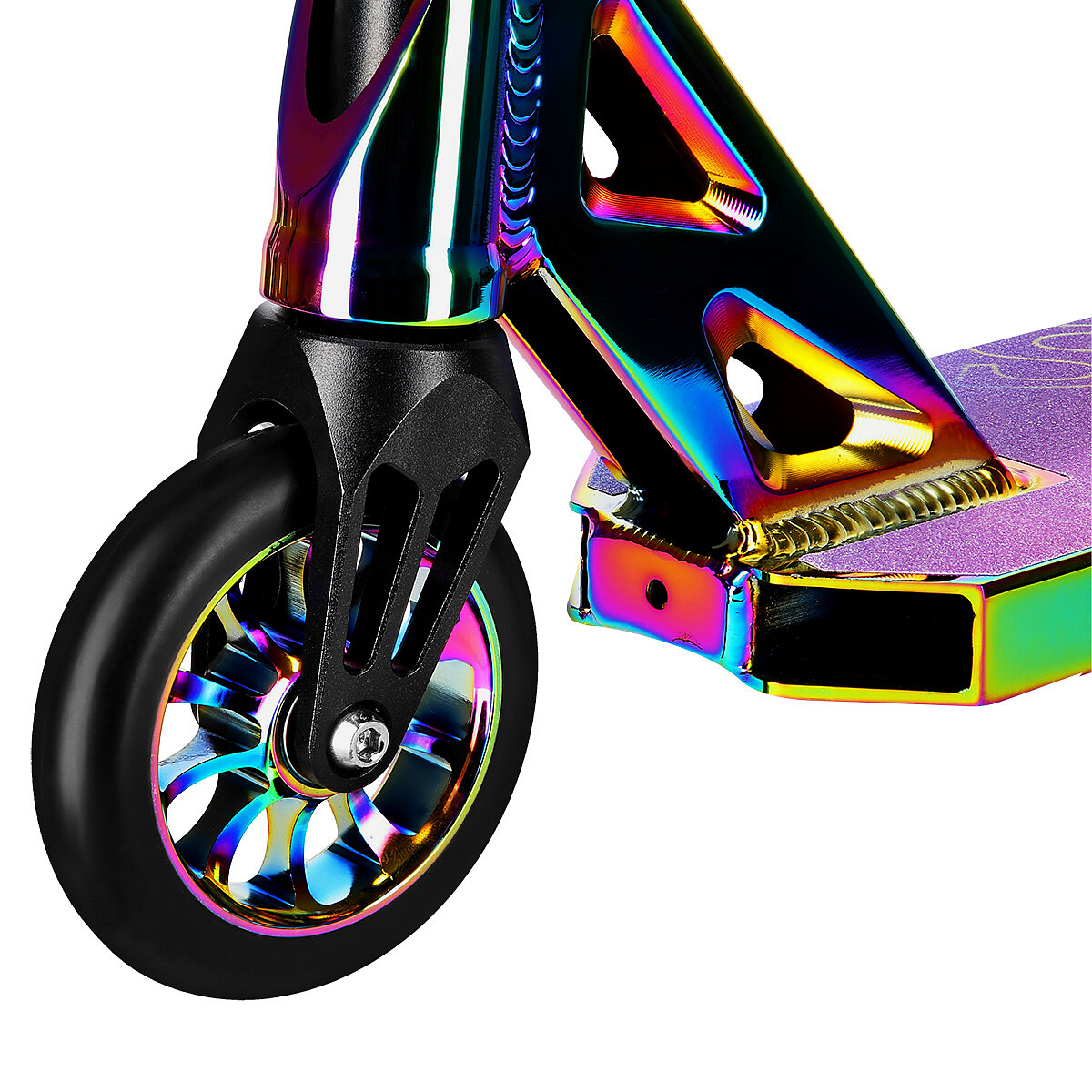 Freestyle kolobežka nemá žiadny skladací mechanizmus ani systém nastavenia výšky riadidiel - tieto typy riešení by mohli oslabiť celú konštrukciu, čo samozrejme nie je žiaduce pri výrobku, pri ktorom je dôležitá odolnosť. Pri vykonávaní trikov sa konštrukcia stretáva s veľmi vysokým zaťažením. Vďaka použitiu masívnej ocele a pevného hliníka je takmer nemožné preťažiť HS014 PRO až na hranicu možností, takže môžete s maximálnou istotou vykonávať aj zložité a náročné triky.
