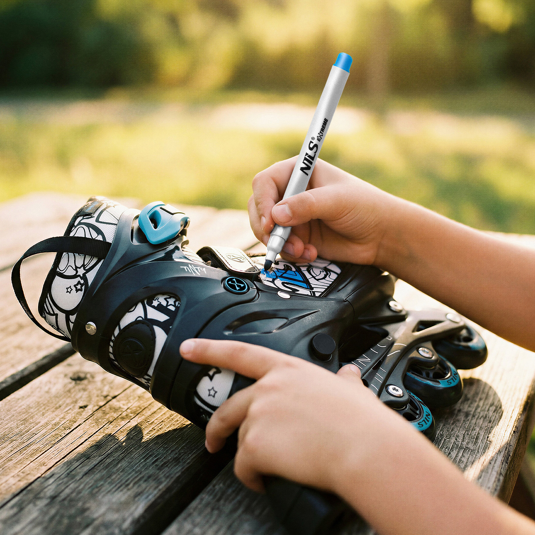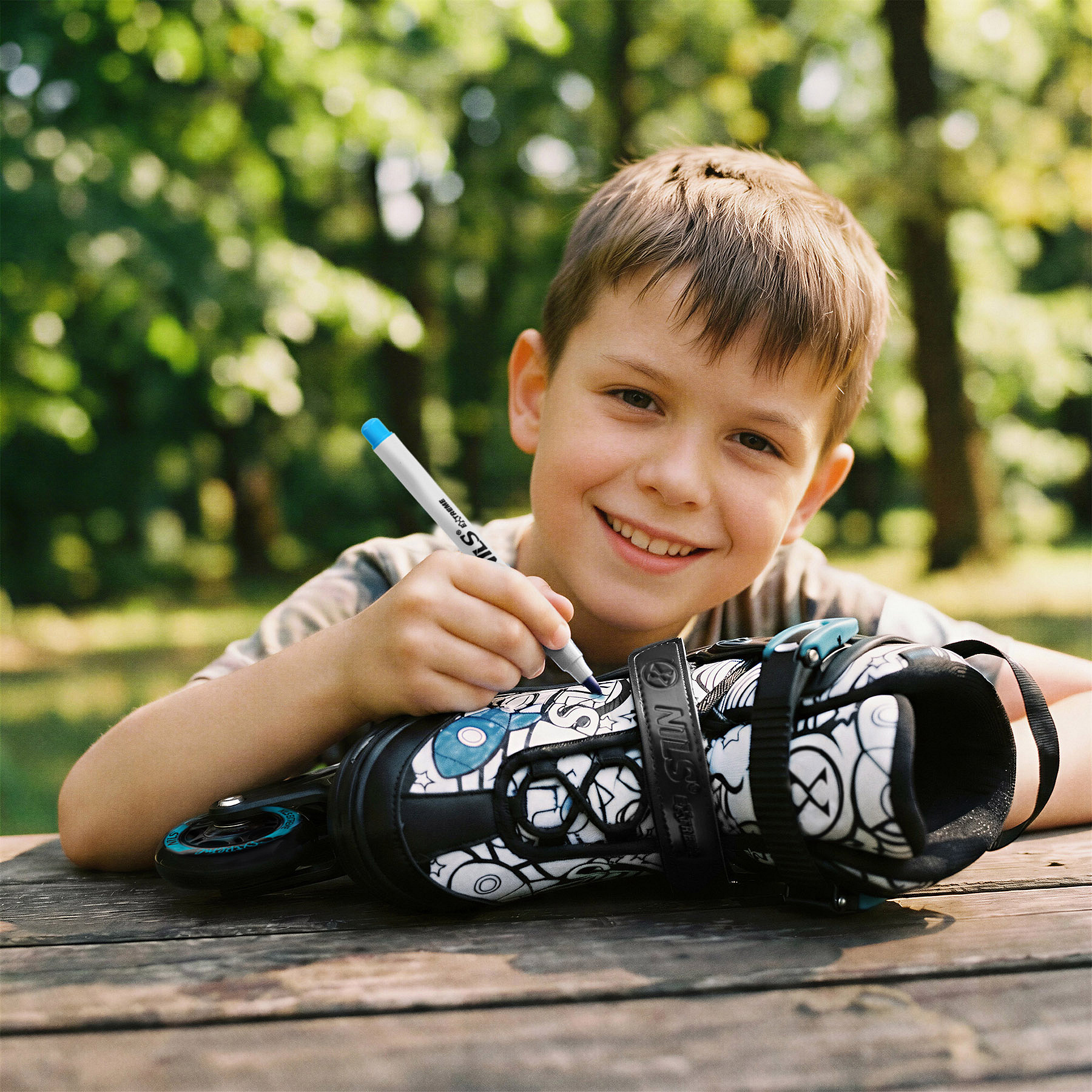Model TINTY není jen funkční, ale také zábavný. Součástí balení je 7 permanentních fixů, kterými si dítě může samo vybarvit vzor na botě a vytvořit vlastní design. Každý pár bruslí tak může být originální a samotné učení jízdy se stává ještě zajímavější a hravější.