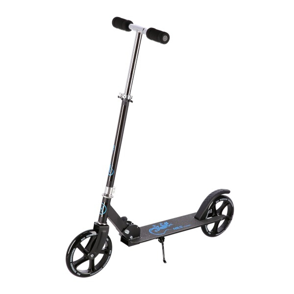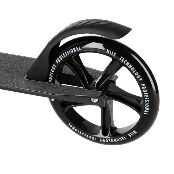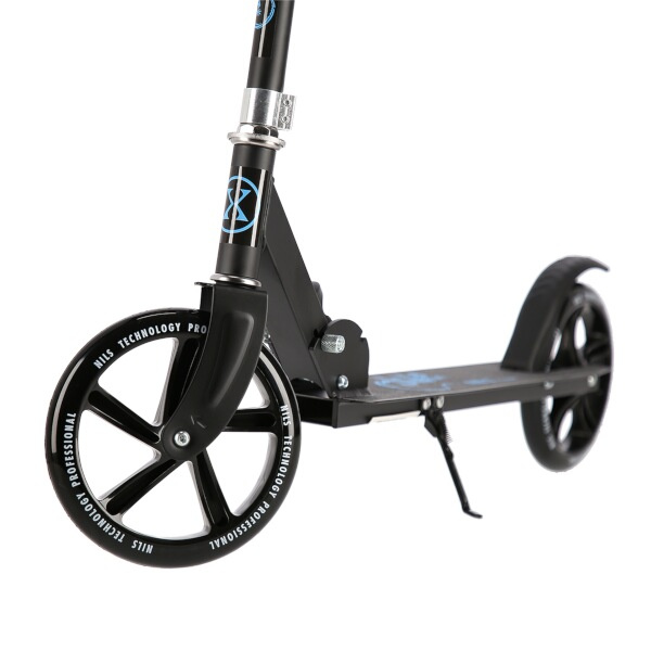 Zadný blatník slúži ako nášľapná brzda. Sklopné riadidlá sú vybavené penovými rukoväťami, ktoré zabezpečujú pevné a pohodlné uchopenie. Riadidlá sú výškovo nastaviteľné do 3 úrovní. Veľké kolesá sú vybavené ložiskami ABEC 7 a polyuretánovými pneumatikami s priemerom 200 milimetrov. Táto kombinácia zaručuje rýchlu, plynulú a bezpečnú jazdu. Skladací stojan umožňuje kolobežku postaviť tak, aby ju nebolo potrebné položiť.