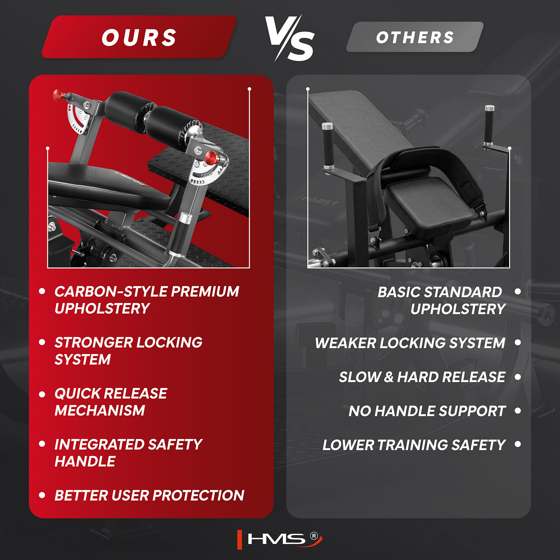 MHT8232 HMS je profesionálny stroj na hip thrust navrhnutý pre maximálne efektívny tréning sedacích svalov a bezpečné používanie. Robustná konštrukcia, maximálne zaťaženie až 500 kg, 10-stupňové nastavenie a komfortné čalúnenie s karbónovým vzhľadom z neho robia ideálne vybavenie pre komerčné posilňovne, fitness centrá aj profesionálne tréningové zóny.