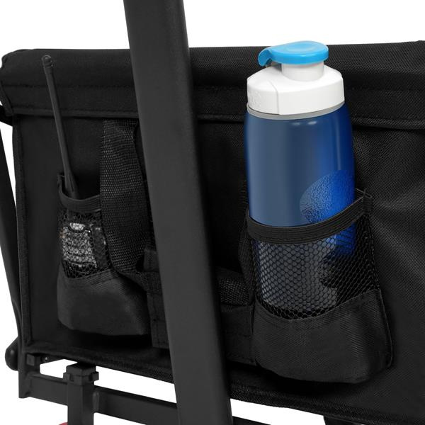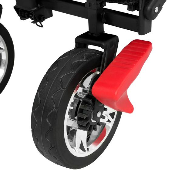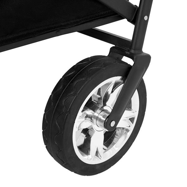 Za hladké vedenie zodpovedajú štyri pevné kolesá s rozmermi 20 x 4,5 cm, vyrobené z kombinácie odolného polypropylénu a gumy. Takáto konštrukcia zaisťuje stabilitu a dobrú priľnavosť na rôznych povrchoch – ako na asfalte, tak na tráve alebo piesku. Nastaviteľná rukoväť (v rozmedzí 76 až 105 cm) sa prispôsobí výške používateľa, čo významne zvyšuje komfort vedenia. Predné kolesá sú vybavené brzdami na zaistenie vozíka na mieste.