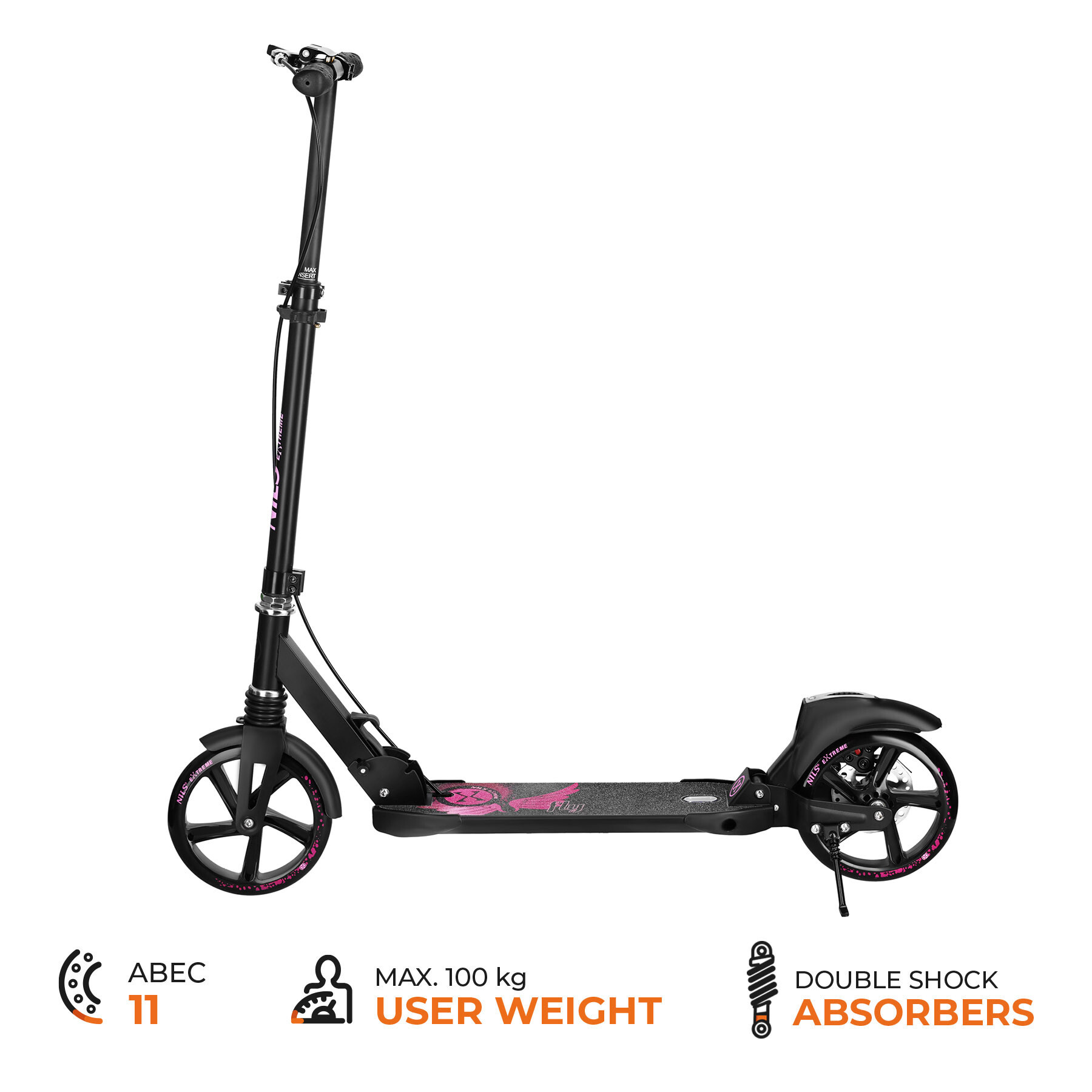 Kola o průměru 200 mm umožňují hladkou jízdu na asfaltu, chodnících i dlažbě. Odolná konstrukce z kombinace oceli a hliníku zvyšuje bezpečnost a životnost, přičemž si koloběžka zachovává optimální hmotnost.